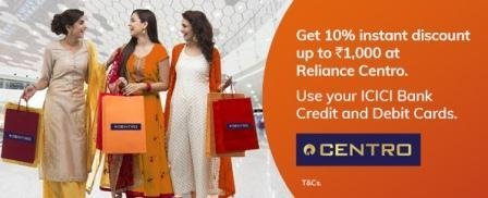 | Centro ICICI Bank Cashback offer | Get a 10% Instant Discount on shopping |
